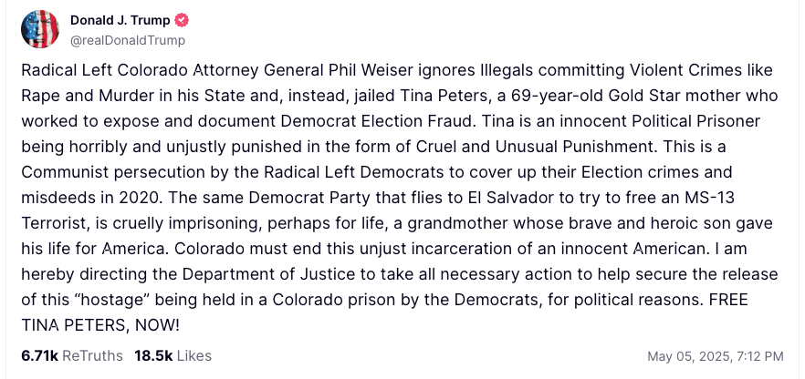 “I am hereby directing the Department of Justice to take all necessary action to help secure the release of this ‘hostage’ being held in a Colorado prison by the Democrats, for political reasons. FREE TINA PETERS, NOW!”